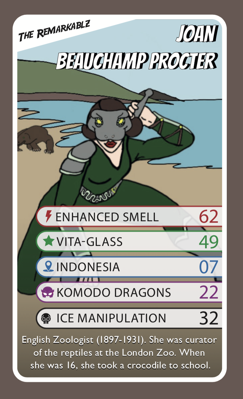 Joan has a super sense of smell. She can smell anything, even at extreme distances. Joan can also link her mind with reptiles, sharing thoughts, memories and emotions.